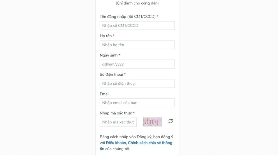 Tại bước này, bạn thực hiện điền các thông tin cá nhân như số căn cước công dân, họ và tên, ngày tháng năm năm, số điện thoại, email và mã xã thực > Nhấn vào Đăng ký.