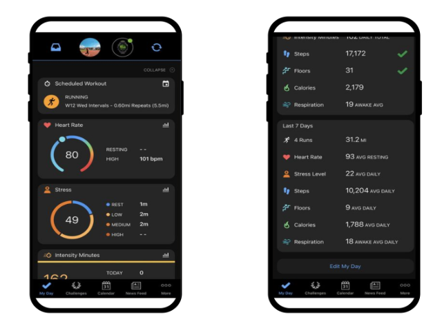 Vào ứng dụng Garmin Connect, chọn “My Day” thể hiện toàn bộ thông số dữ liệu của bạn trong 24 giờ qua. Bạn có thể mở rộng phần này để xem thêm dữ liệu, và mục này sẽ cho bạn biết các dữ liệu gồm: nhịp tim lúc nghỉ ngơi, số phút tập luyện, lượng calo tiêu thụ, nhịp thở, các hoạt động, số bước chân, giấc ngủ, mức độ stress, và lượng calo của bạn