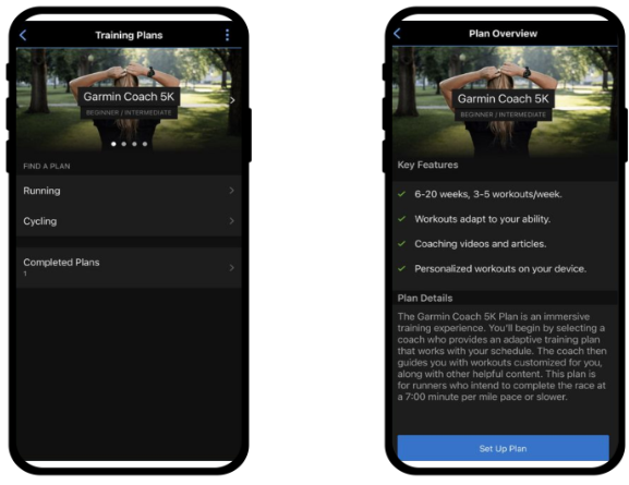 Garmin Coach trên Garmin Connect, bạn có thể tìm tải các kế hoạch tập luyện tự động và đồng bộ nó với Garmin watch mỗi ngày. Truy cập “More” -> “Training and Planning” -> “Training Plans”. Garmin Coach sẽ cung cấp cho bạn đa dạng các kế hoạch luyện tập phù hợp với khả năng của bạn, và nó hoàn toàn miễn phí.