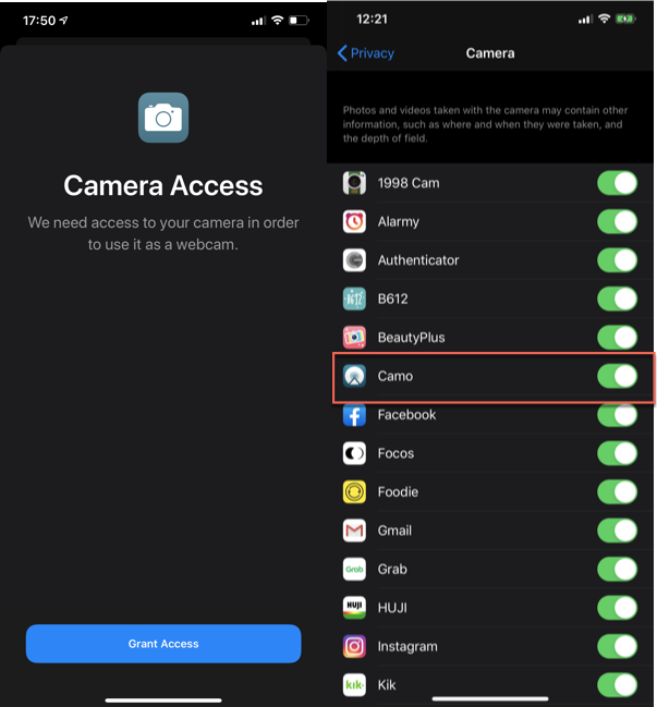 Trên thiết bị iOS, ở màn hình Camera Access, bạn chú ý bấm vào nút Grant Access rồi cấp quyền cho ứng dụng Camo sử dụng camera của máy.