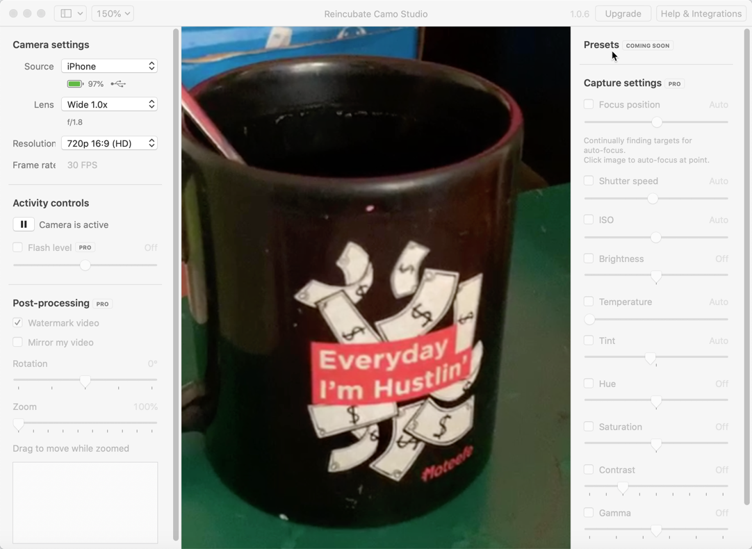 Nếu muốn nâng cao độ phân giải webcam lên HD 1080p, và tùy chỉnh thêm nhiều thông số nâng cao khác như độ sáng, độ bão hòa, ISO, nhiệt độ màu, tốc độ màn trập... bạn cần nâng cấp Camo Studio lên bản PRO có giá 39.99 USD/năm.