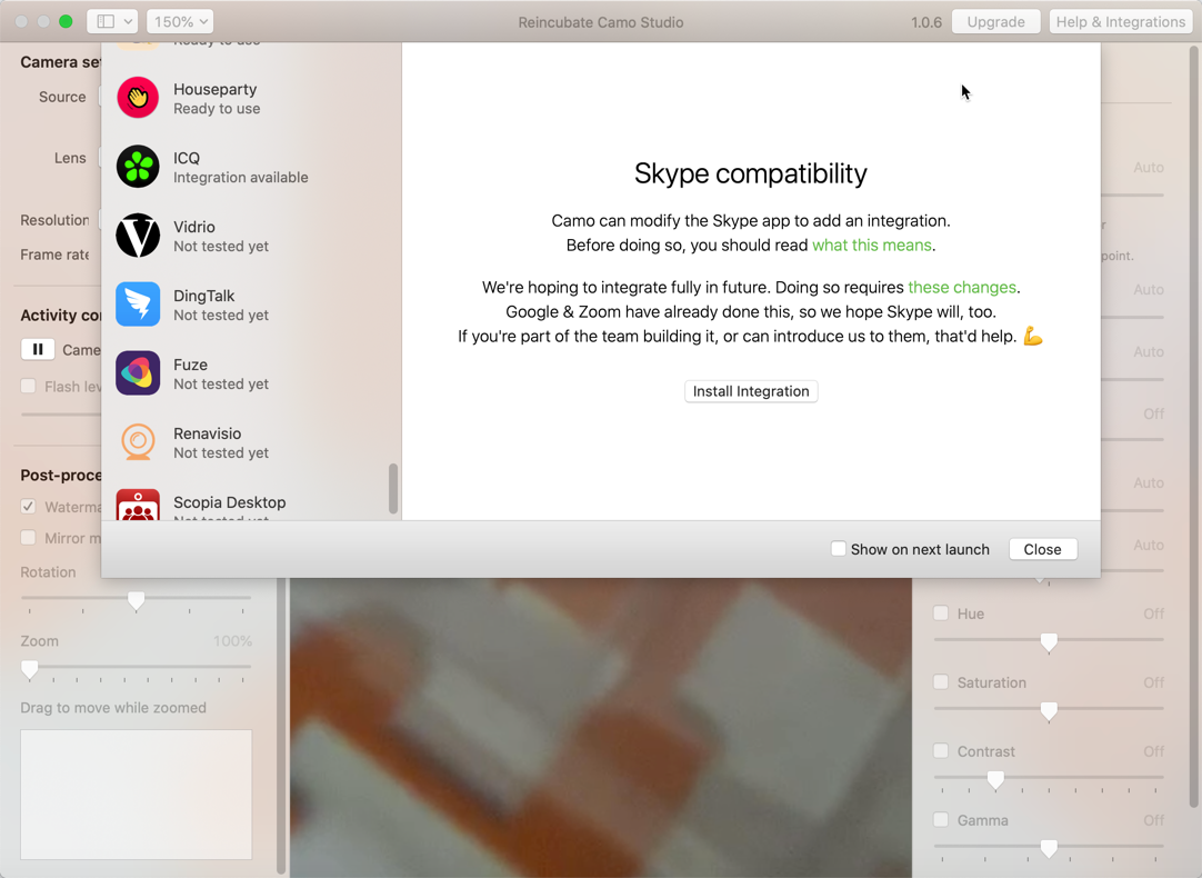 Với các ứng dụng có chữ Ready to use, bạn có thể sử dụng ngay webcam mà không cần cài thêm gì cả. Với các ứng dụng có chữ Integration available (ví dụ như Skype), bạn cần bấm vào tên ứng dụng đó, rồi bấm nút Install integration để cài thêm tiện ích giúp tích hợp Camo vào ứng dụng. Cài xong, bạn khởi động lại ứng dụng để hoàn tất cài đặt, rồi vào phần thiết lập ứng dụng, chọn nguồn webcam là Reincubate Camo.