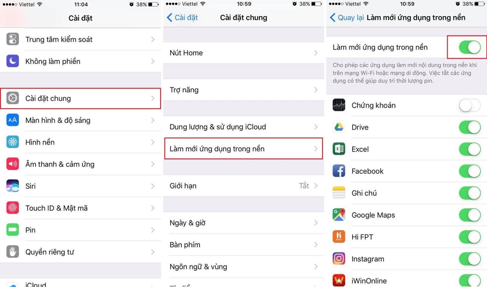 Để đảm bảo thời lượng pin cho việc sử dụng, bạn nên hạn chế việc kích hoạt chế độ này bằng cách truy cập vào Cài đặt > Cài đặt chung > Làm mới ứng dụng trong nền. Tại đó, bạn sẽ thấy một danh sách các ứng dụng được làm mới trong nền và bạn có thể tắt chúng đi nếu muốn.