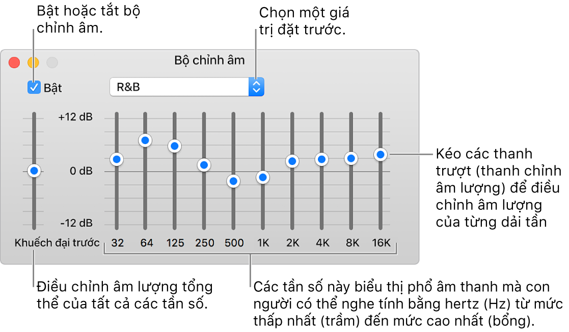 Kéo các thanh trượt tần số lên hoặc xuống để tăng hoặc giảm âm lượng của tần số (tính bằng decibel).