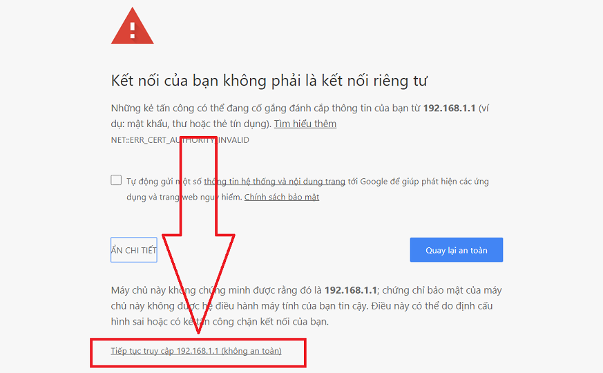 Bước 2: Chấp nhận kết nối không an toàn bằng việc click vào nâng cao> tiếp tục truy cập 192.168.1.1 (không an toàn).
