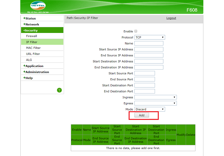 Ở bước này người dùng thêm địa chỉ IP bao gồm địa chỉ IP nguồn và IP đích muốn chặn, sau đó click vào Add, tiếp tục click vào Enable để lưu lại thay đổi.