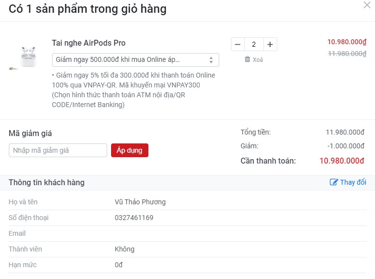 Bước 2: Chọn Mua ngay (Ví dụ bạn chọn mua tai nghe trong hình, tổng giá trị 5.490.001 đồng).