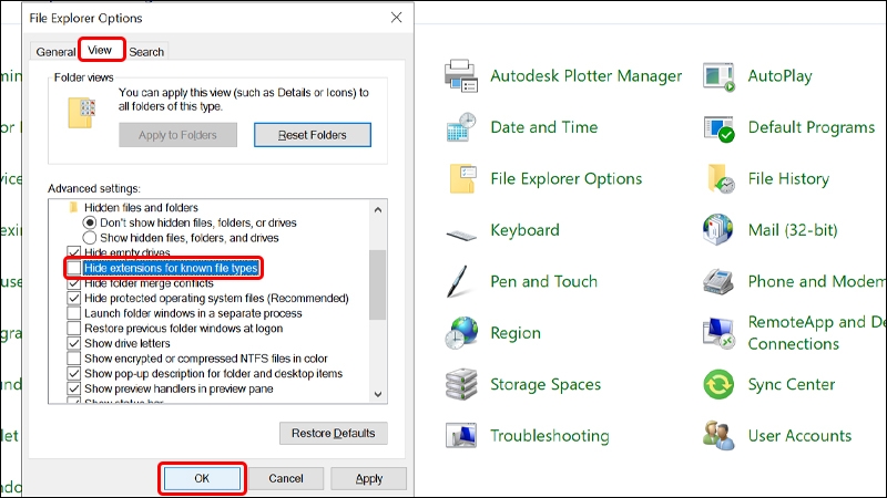 Bước 3: Chuyển sang tab View → Bỏ tích chọn tại mục Hide extensions for known file types → Chọn OK.