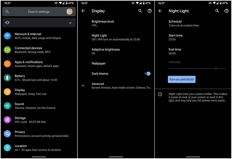 Bộ lọc ánh sáng xanh còn được biết đến với tên gọi Night Light trên hệ điều hành Android. Tính năng hữu ích này cho phép người dùng áp dụng một bộ lọc màu lên màn hình để giảm thiểu tình trạng mỏi mắt và giảm luôn lượng ánh sáng xanh phát ra từ đó.