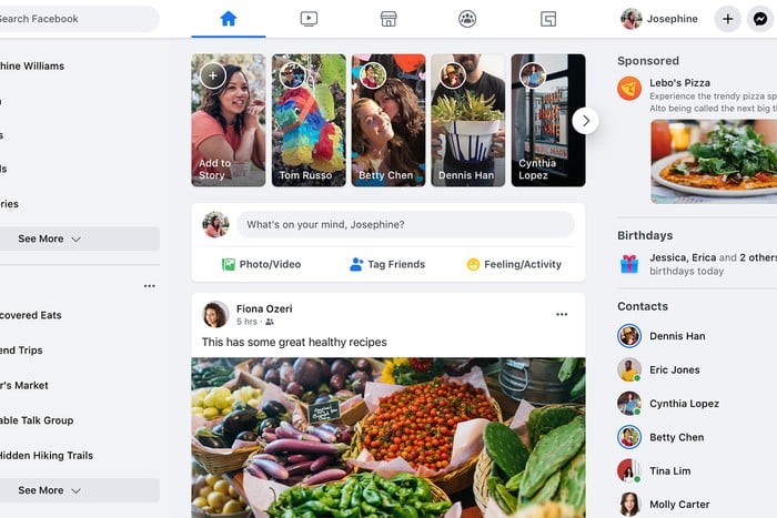 Với giao diện mới này, Facebook sẽ sử dụng một cách điều hướng mới tương tự như các ứng dụng mobile hiện có bằng các tab như Home – Watch – Marketplace – Groups – v.v... Màn hình chính của người dùng có kích cỡ lớn hơn, các shortcut phụ được đặt trong thanh sidebar phía bên trái. Mục Stories cũng nhảy lên phía trên cùng, ngay phía bên dưới là ô trống để post status.