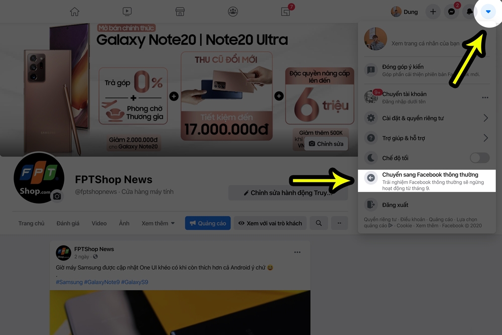 Để bật giao diện mới, bạn hãy truy cập vào menu Cài đặt (Dấu mũi tên) ở phía bên phải và chọn mục Chuyển sang phiên bản Facebook mới. Nếu muốn quay lại giao diện cũ, bạn chỉ việc chọn Chuyển sang Facebook thông thường là được. Cụ thể như sau: