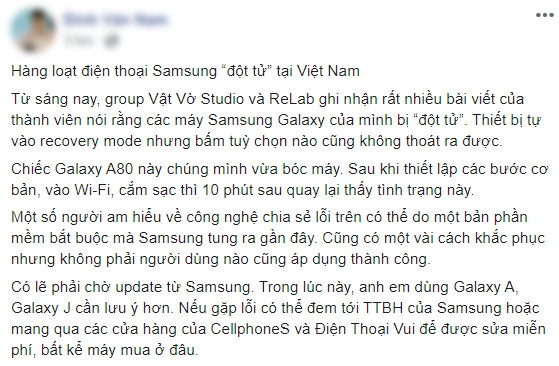 Hiện tại theo một số group Facebook chia sẻ thì lỗi này có thể do một bản phần mềm bắt buộc mà Samsung tung ra gần đây. Samsung vẫn chưa thông tin về lỗi này tuy nhiên điều quan trọng là nếu thao tác không đúng, rất có thể điện thoại của bạn sẽ bị mất dữ liệu.