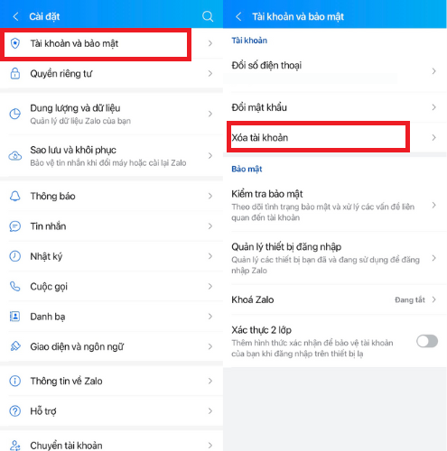 Bước 2: Vào mục Tài khoản và bảo mật, sau đó chọn mục chọn Xóa tài khoản.