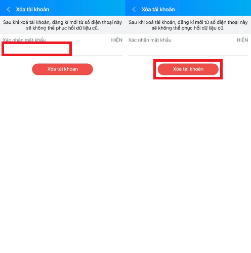 Bước 4: Xác nhận Mật khẩu để Zalo chắc rằng bạn thực sự là chủ nhân của tài khoản cần xoá vĩnh viễn, sau đó nhấn Xoá tài khoản. Thông báo hiện lên, bạn tiếp tục nhấn Xoá tài khoản một lần nữa để xác nhận.