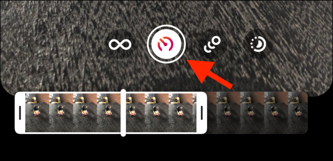 Tính năng cắt ghép này hiện diện trong tất cả các chế độ. Để thay đổi sang chế độ Slow-mo, bấm vào nút Slow-mo hoặc cuộn qua bên trái ở hàng trên timeline. Trong Slow-mo, Boomerang có tốc độ playback chỉ được 1/2 so với ban đầu.