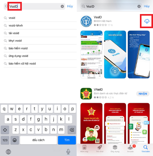 Bước 1: Truy cập vào App Store trên điện thoại iPhone hoặc CH Play trên Android, nhập từ khóa VssID để tìm kiếm ứng dụng, sau đó chọn biểu tượng tải xuống ở bên phải đối diện với tên ứng dụng.