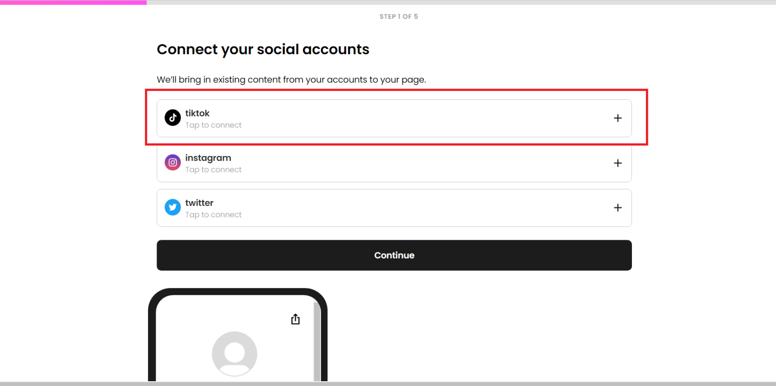 Bước 3: Sau khi hoàn tất đăng ký, bạn bắt đầu chọn nền tảng mà mình muốn sử dụng để gắn link bio, hãy bấm vào TikTok. Sau đó bạn nhập tên kênh TikTok của mình vào ô trống rồi bấm Continue để sang bước tiếp theo.