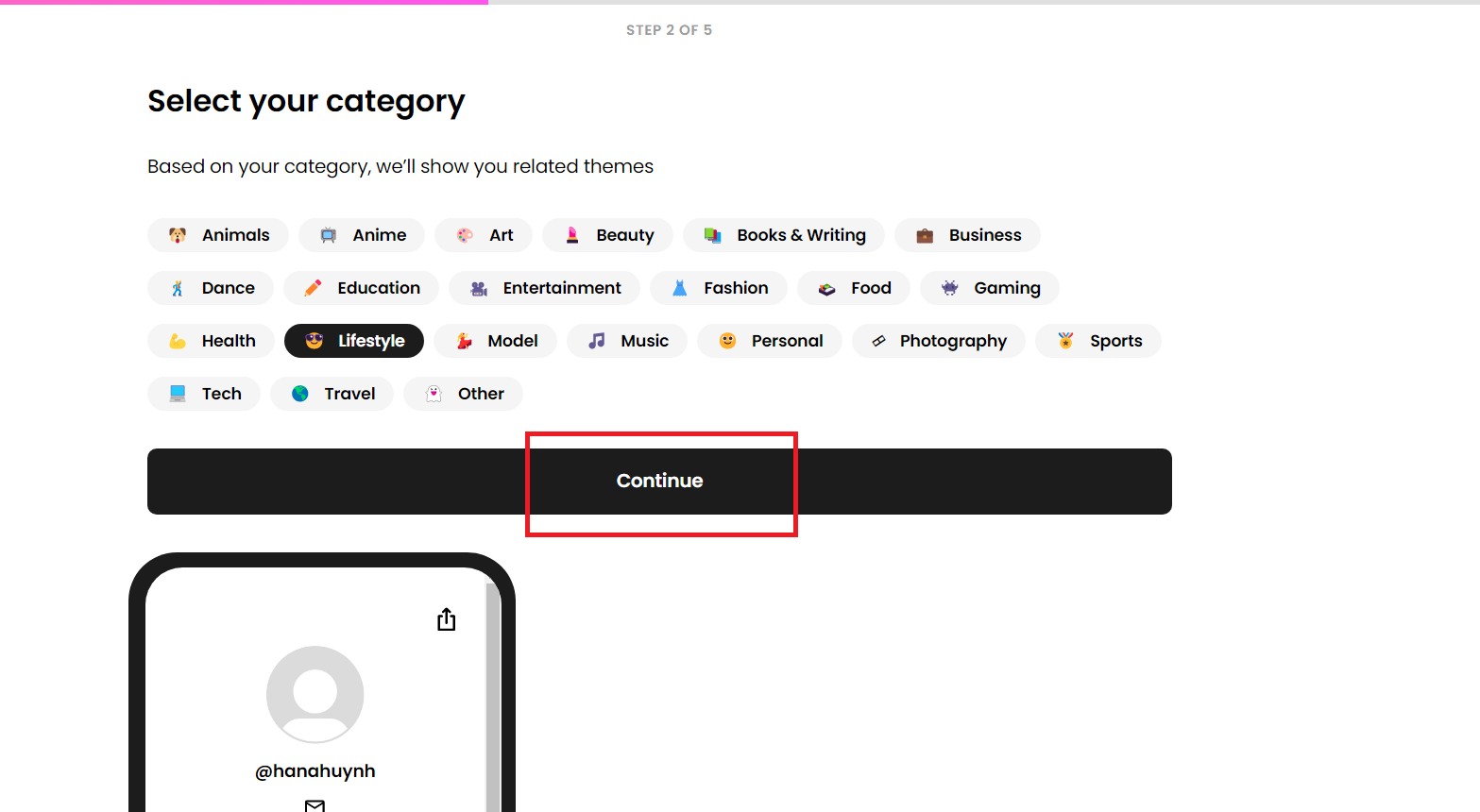 Bước 4: Chọn nội dung kênh TikTok của bạn hướng tới, việc này sẽ giúp Beacons gợi ý cho bạn một số chủ đề phù hợp ở bước tiếp theo. Sau khi chọn xong bạn tiếp tục bấm Continue.