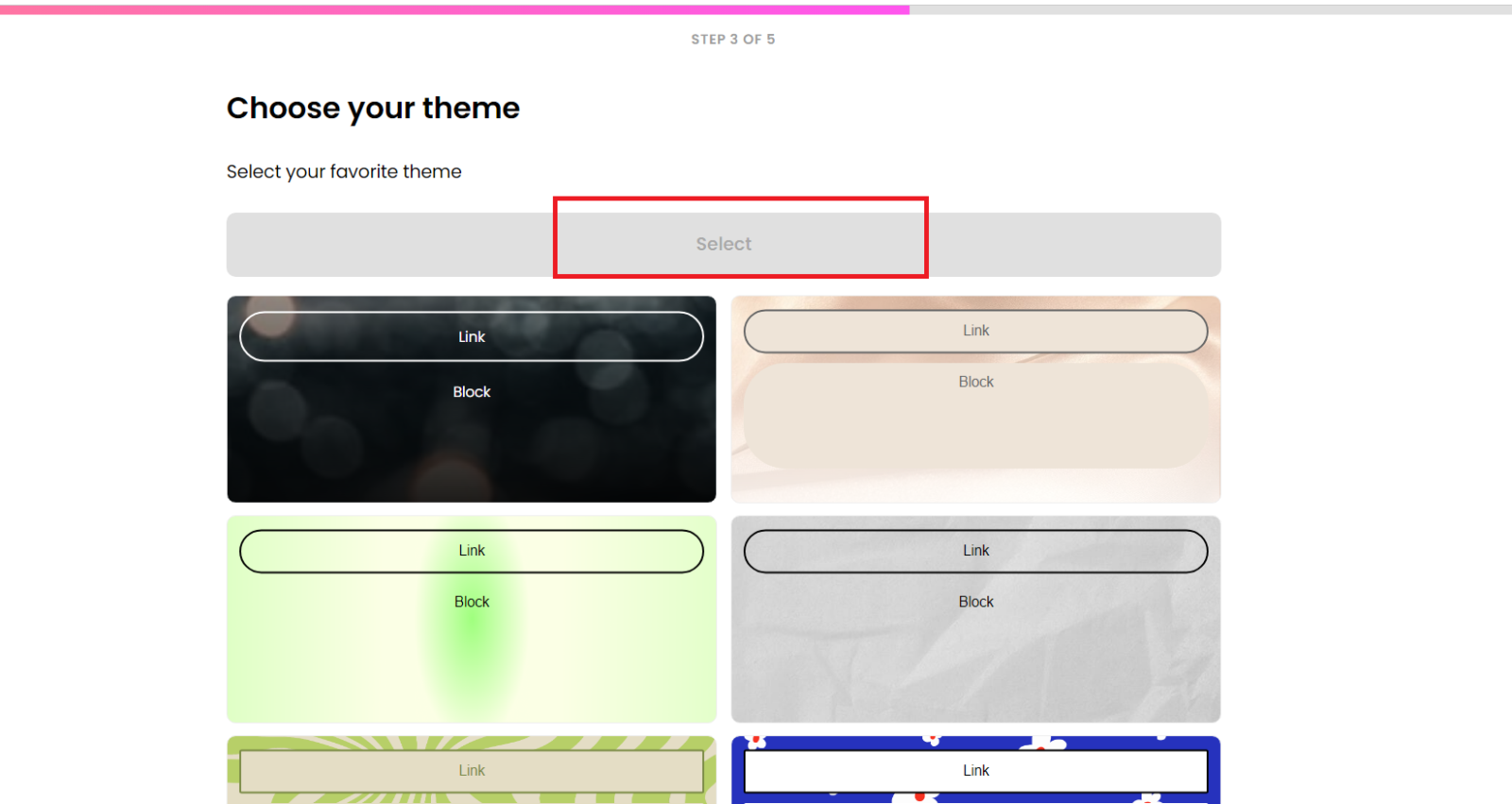 Bước 5: Chọn chủ đề cho trang bio của bạn theo sở thích, sau khi chọn xong bạn hãy bấm Select. Chuyển sang bước tiếp theo Beacons sẽ gợi ý cho bạn nâng cấp tài khoản lên phiên bản trả phí để có thể sử dụng hết tính năng của Beacons, nếu bạn không có nhu cầu hãy bấm bỏ qua.