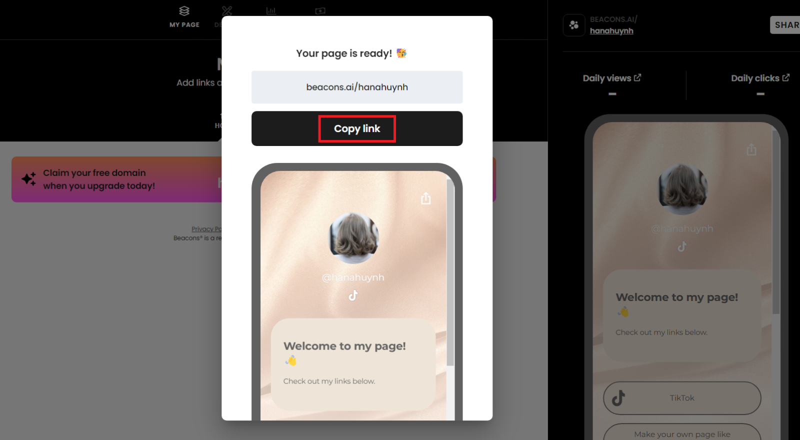 Bước 6: Vậy là bước đầu trang bio của bạn đã được tạo thành công, giờ đây bạn có thể copy link bio và gắn vào kênh TikTok của mình.