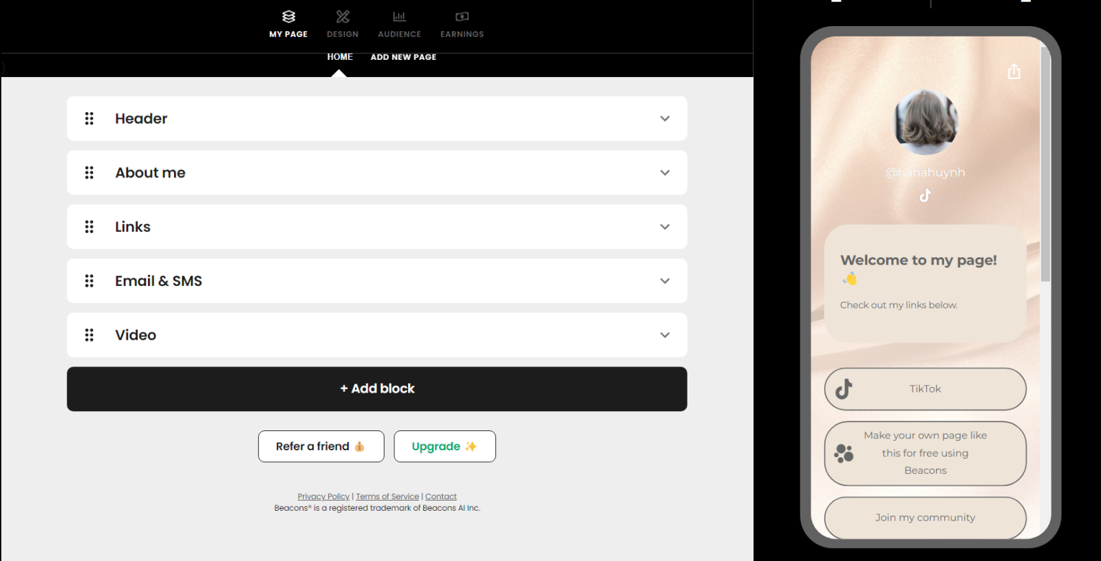 Beacons: đây là nền tảng mà nhiều KOLs sử dụng nhất trên TikTok. Tuy giao diện có hơi phức tạp hơn hai nền tảng ở trên nhưng trang web này hoàn toàn miễn phí và có những công cụ vô cùng xịn sò. Dù cần chèn thông tin tài khoản mạng xã hội hay tiếp thị liên kết, Beacons đều có thể giúp bạn thực hiện.