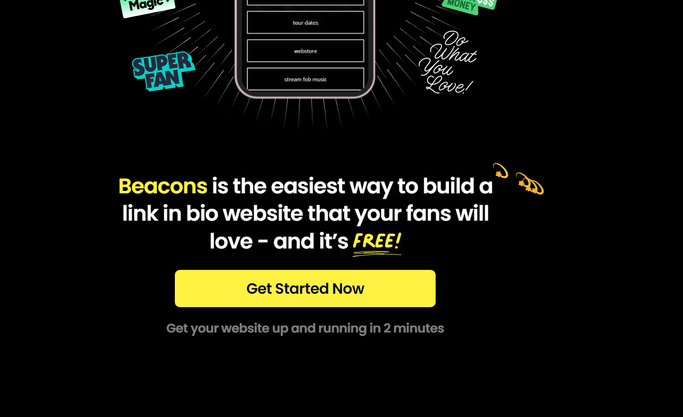 Bước 1: Khi truy cập vào trang web Beacons, bạn sẽ nhìn thấy chữ Get Started Now, bấm vào đây để bắt đầu thiết kế trang bio cho riêng mình.