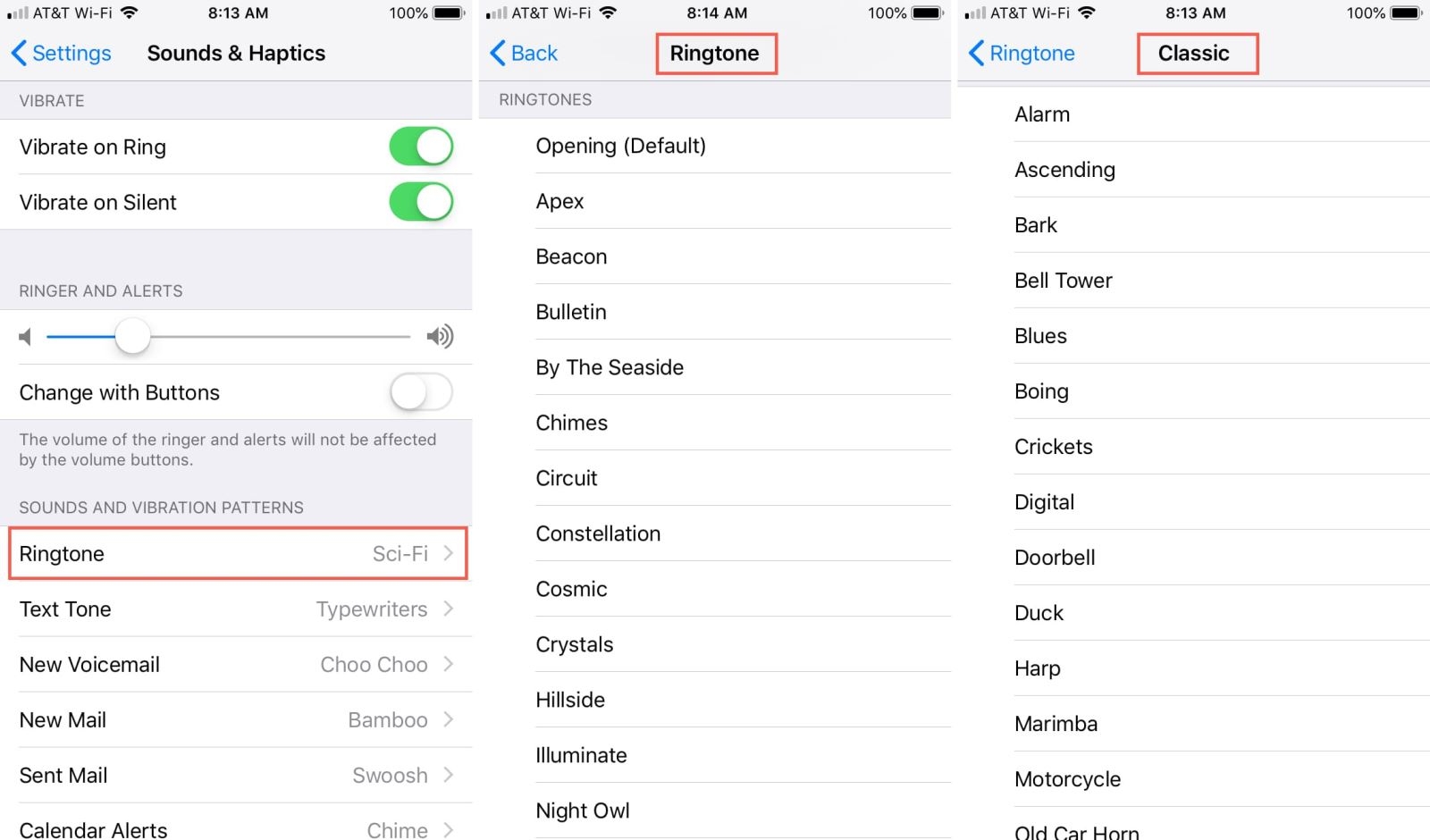 3. Đối với mỗi tuỳ chọn, bạn có thể nghe được âm thanh của những đoạn nhạc chuông đó. Ở phía dưới cùng trong mục Ringtone, bạn hãy bấm vào Classic để có thể tìm đến nhiều tuỳ chọn khác hơn.