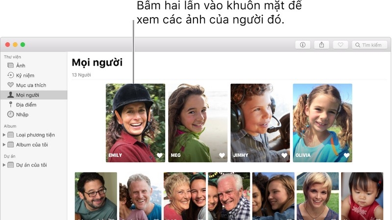 Khi bạn mở Ảnh lần đầu tiên, ứng dụng quét thư viện để nhận dạng mọi người trong các ảnh của bạn. Sau khi quét xong, bạn có thể mở album Mọi người, xem các bộ sưu tập ảnh được sắp xếp theo các khuôn mặt trong đó và chỉ định tên cho những người mà Ảnh tìm thấy.