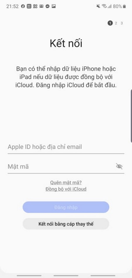 Bước 3: Nhập vào thông tin tài khoản AppleID của bạn (trường hợp bạn không thực hiện bước 1, bạn có thể chọn Kết nối bằng cáp thay thế với điều kiện bạn có cáp kết nối được từ iPhone sang Samsung Galaxy Note 10).