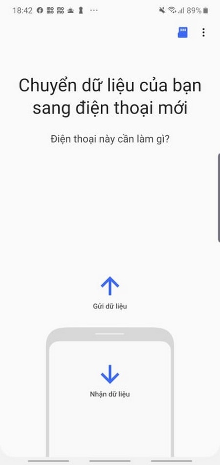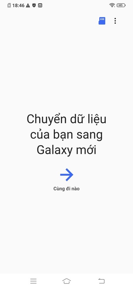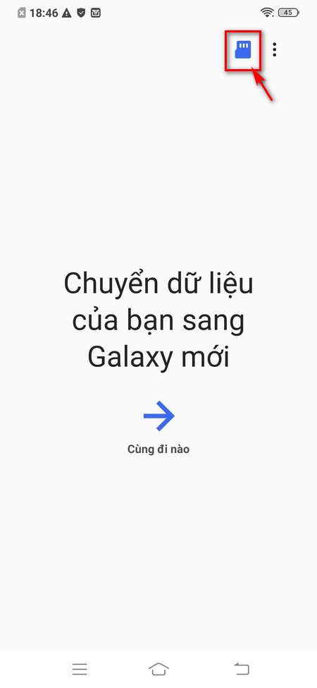 Bước 1: Trên điện thoại Android cũ, bạn cắm thẻ nhớ vào rồi mở ứng dụng Smart Switch lên. Ở phía góc trên bên phải có hình thẻ nhớ, bạn hãy bấm vào đây.