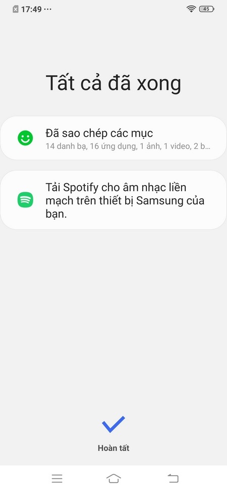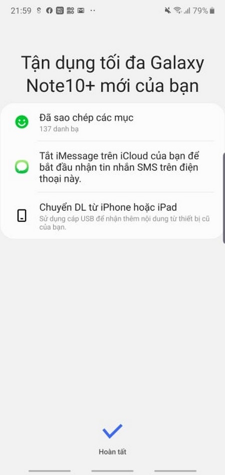 Bước 7: Sau khi dữ liệu được chuyển đổi hết, bạn sẽ nhận giao diện như dưới đây trên điện thoại Galaxy Note 10 của mình. Bạn hãy bấm Hoàn tất để kết thúc chuyển đổi dữ liệu.