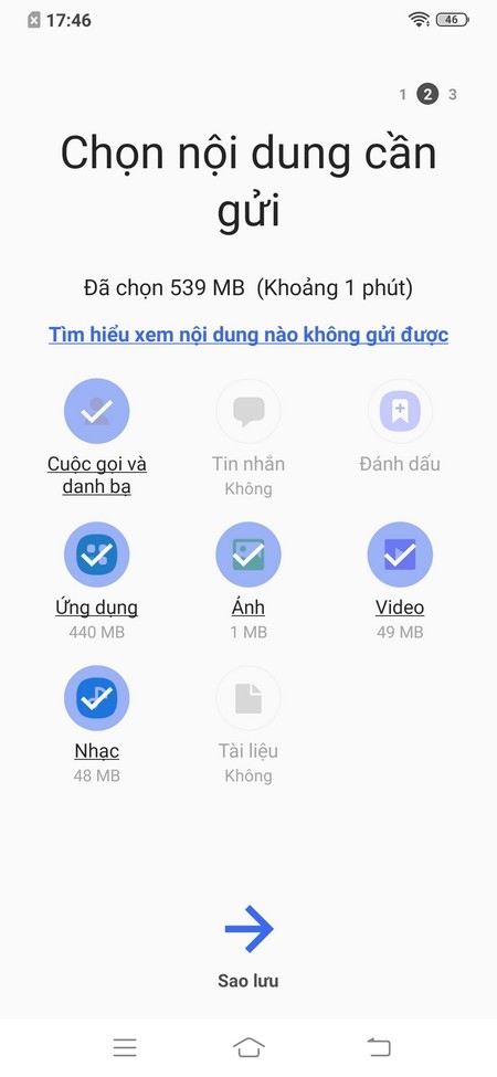 Nếu kết nối thành công, màn hình điện thoại cũ của bạn sẽ chuyển qua giao diện chọn các dữ liệu cần chuyển qua. Bạn hãy chọn các nội dung cần chuyển qua điện thoại Galaxy Note 10 mới, sau đó bấm nút Sao lưu.