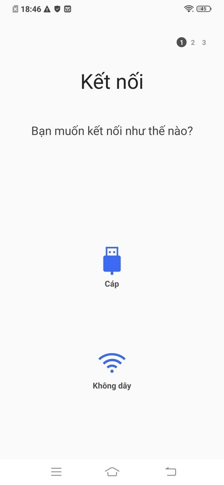 Bước 3: Chọn hình thức chuyển dữ liệu. Bạn có thể kết nối cáp USB giữa hai thiết bị, tuy nhiên theo mình thì bạn hãy chọn Không dây vì mình đã kiểm tra thử cả hai chế độ thì thấy truyền không dây tốc độ cũng không chậm nhiều so với dùng cáp đâu, ngoài ra mọi thức đều được thiết lập tự động bạn không cần phải cắm dây rất mất công.