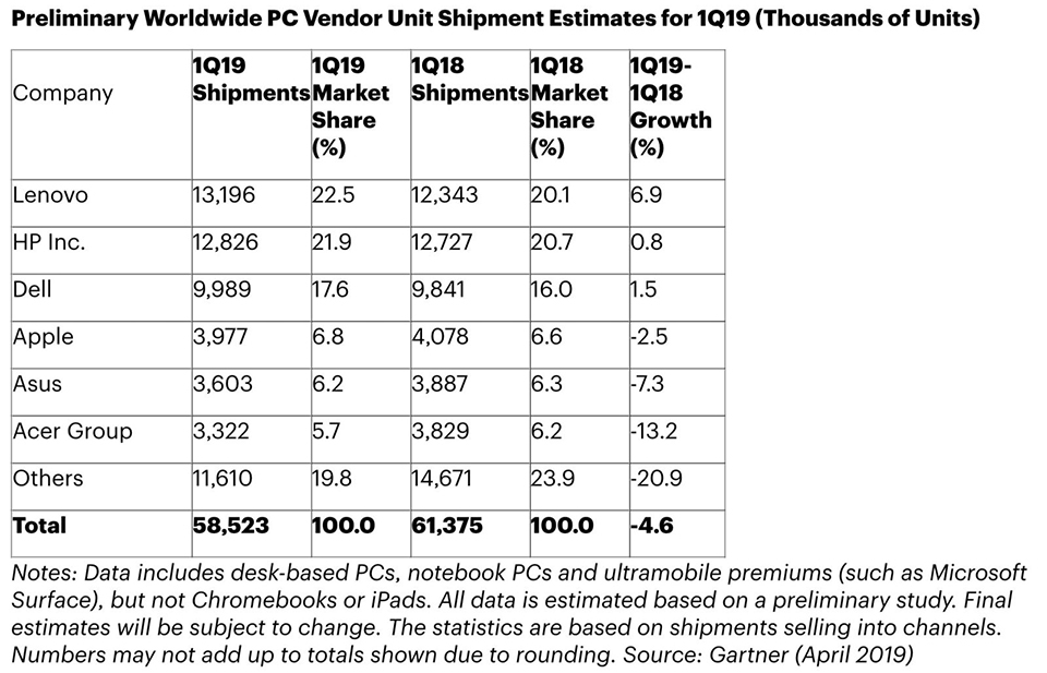 Cổ phiếu của Apple vẫn tăng trưởng, bởi vì không chỉ Apple mà toàn thị trường PC đều bị sụt giảm. Trên thực tế, cả 5 nhà sản xuất máy tính hàng đầu đều có doanh số giảm tại Mỹ trong quý 1/2019.