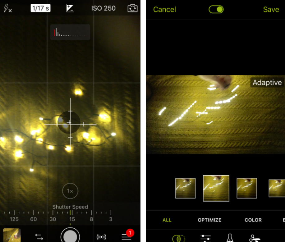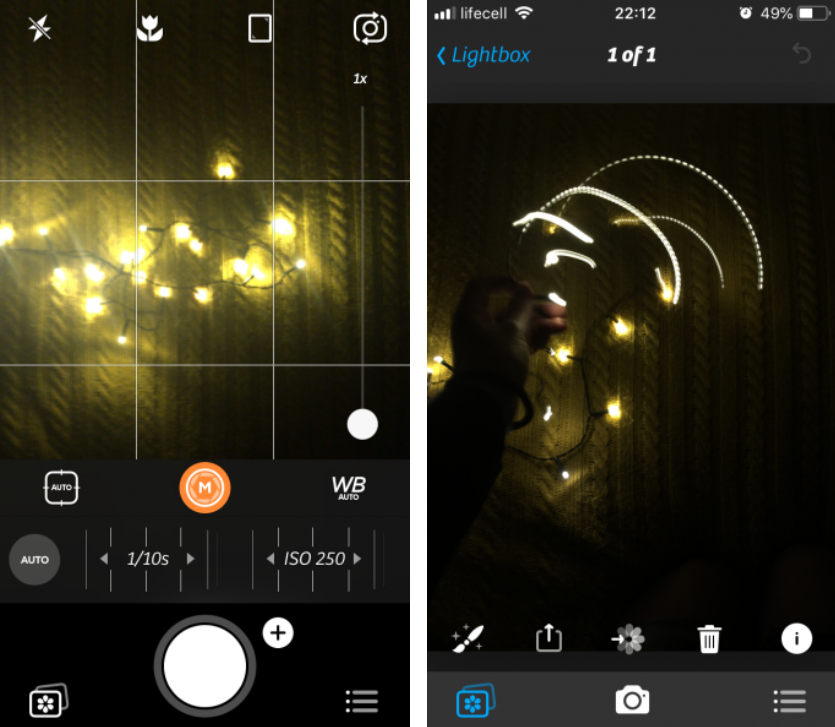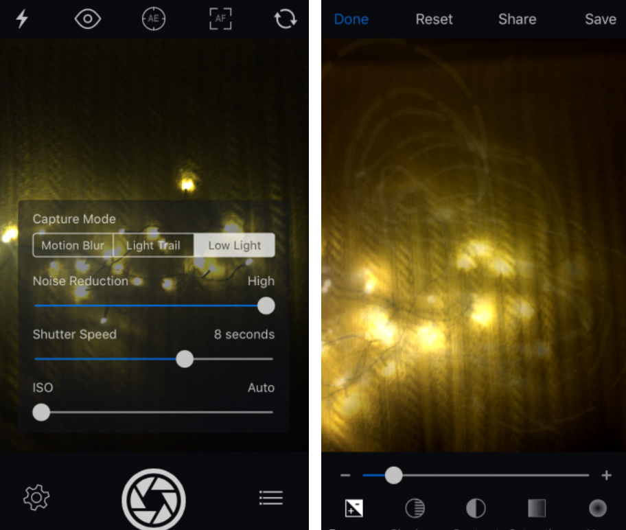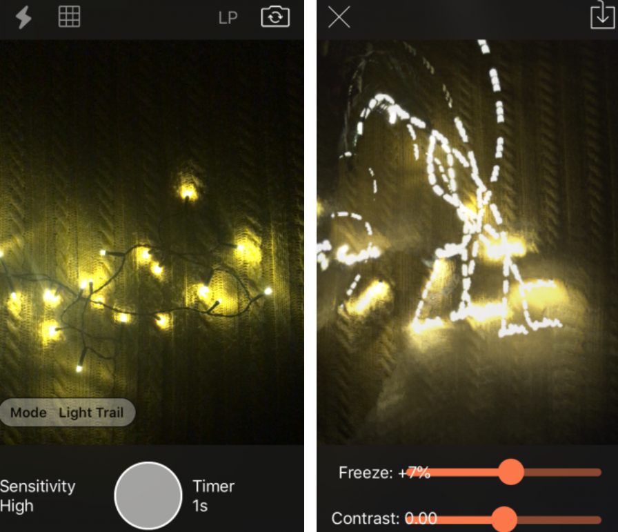 Khi bạn khởi chạy ứng dụng, nó sẽ nhắc bạn chọn chế độ, Bình thường hoặc Light Trail, điều chỉnh độ nhạy sáng và đặt hẹn giờ. Bằng cách nhấn biểu tượng lưới ở góc trên cùng bên trái, bạn có thể thêm lưới quen thuộc để bố cục tốt hơn và biểu tượng flash ở cùng một góc. Khi bạn chụp, bạn có thể làm cho nó bớt mờ hơn bằng cách điều chỉnh thủ công tăng hoặc giảm độ tương phản trước khi lưu ảnh vào Camera Roll của bạn.