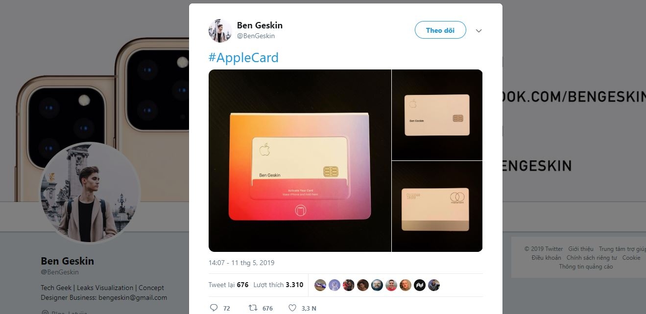 Mới đây, tài khoản Twitter - Ben Geskin đã đăng tải lên trang cá nhân cho thấy thẻ tín dụng mới của Apple. Được biết, một số nhân viên của Apple đã bắt đầu nhận được loại thẻ này, trước đó nó đã được công bố vào tháng 3/2019.