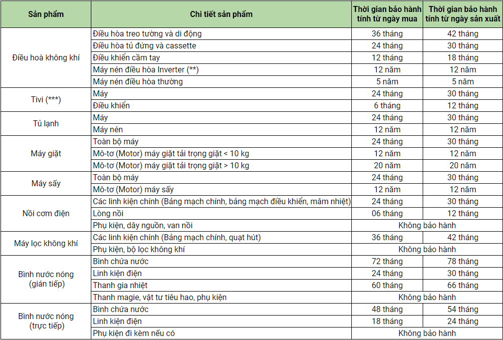 (**) Chính sách bảo hành đối với máy nén điều hòa không khí inverter chỉ áp dụng mục đích dùng cho cá nhân, hộ gia đình. Nếu sản phẩm được sử dụng trong cơ sở kinh doanh thương mại (nhà hàng, nhà nghỉ, khách sạn, căn hộ dịch vụ…) hoặc trong các dự án (sân bay, nhà ga, công trình công cộng,…), thời hạn bảo hành sẽ là 05 năm kể từ ngày đăng ký bảo hành hoặc ngày mua hàng hợp lệ nhưng không quá thời gian bảo hành tính từ ngày sản xuất tương ứng được quy định tại bảng trên.