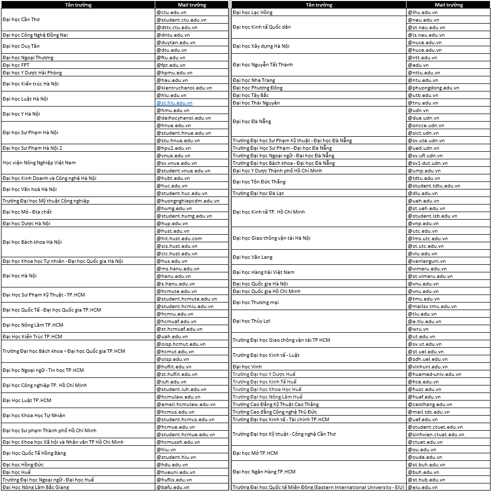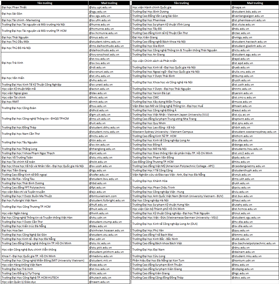 Đối tượng áp dụng: Sinh viên thuộc các Trường có email trường hợp lệ theo danh sách bên dưới: