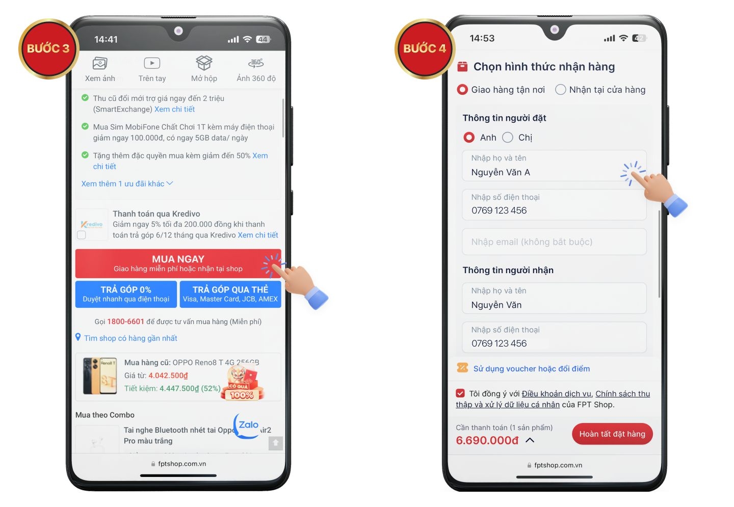 Bước 4: Tại giỏ hàng, điền thông tin Người đặt hàng, Người nhận hàng