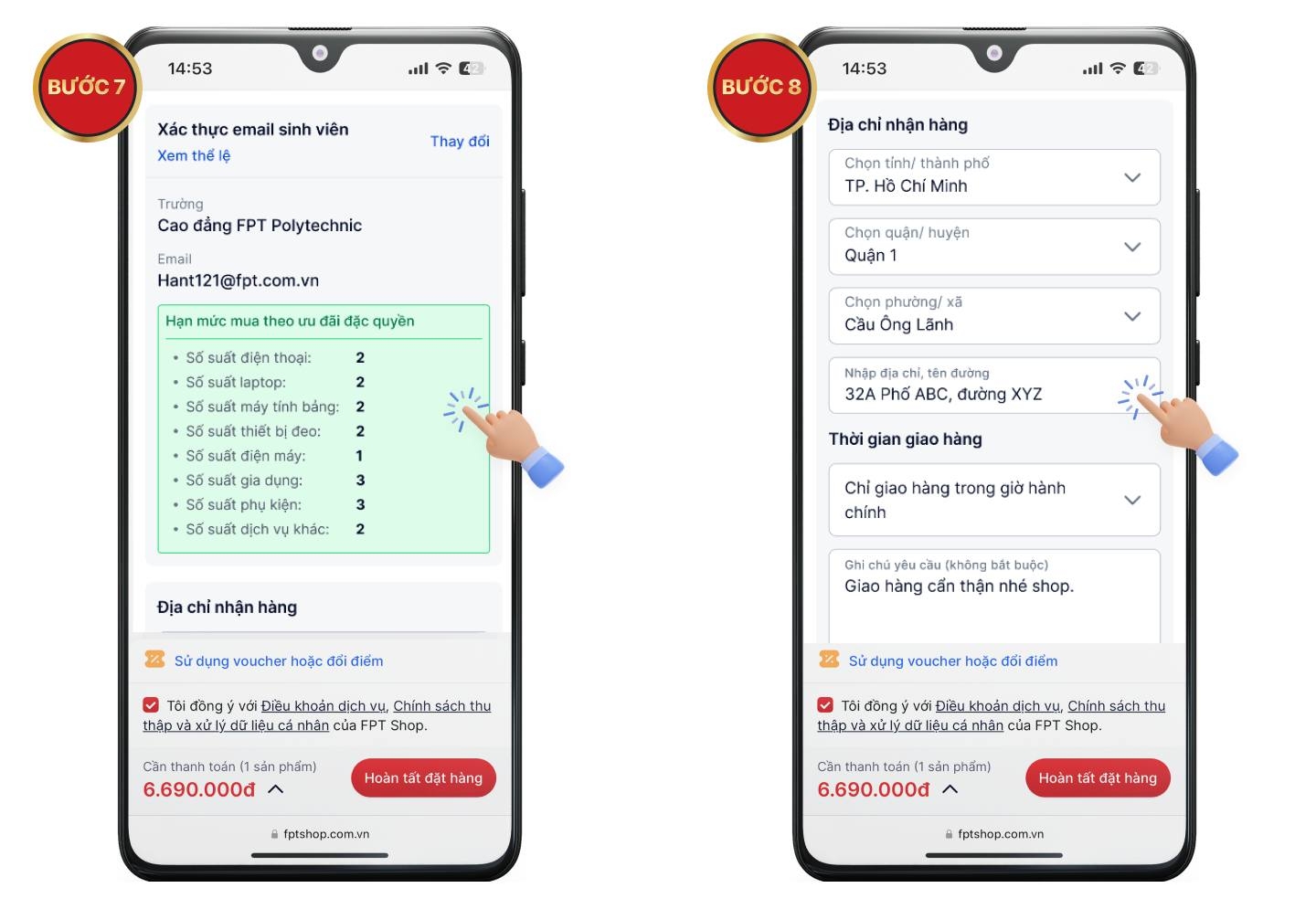 Bước 8: Nhập Địa chỉ nhận hàng, Thời gian giao và Hình thức thanh toán để Hoàn tất đặt hàng.