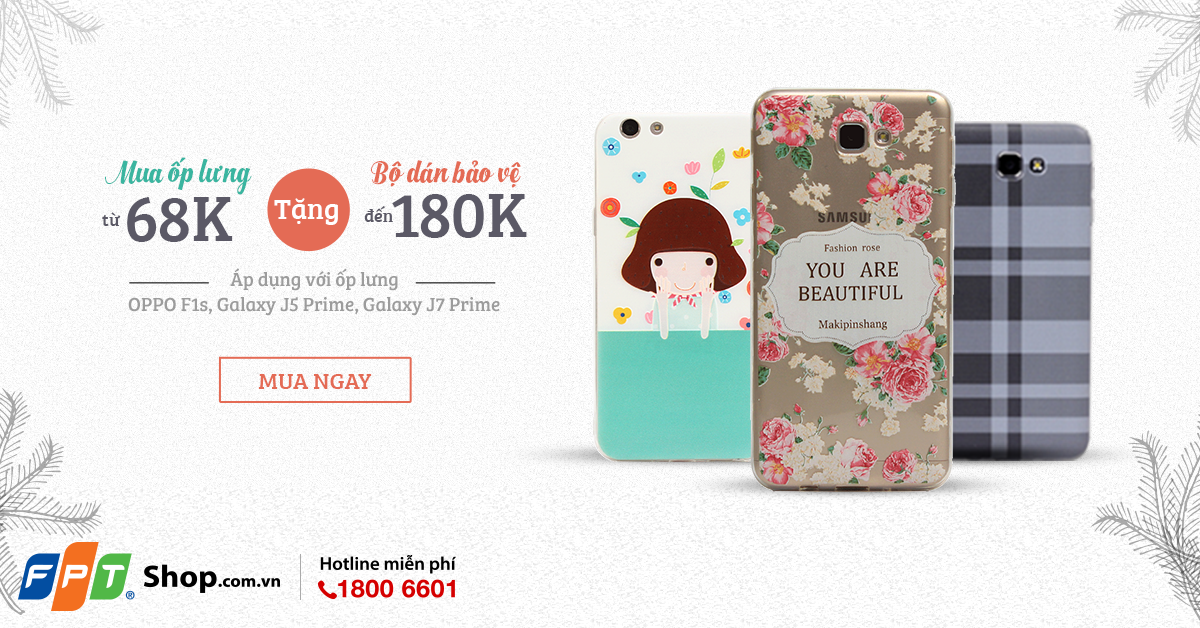 Với giá từ 68.000 đồng cho bao da, ốp lưng OPPO F1s và từ 99.000 đồng với bao da, ốp lưng J5 Prime, J7 Prime, một mức giá khá "nhẹ nhàng", bạn có thể thoải mái chọn cho mình sản phẩm ừa bảo vệ smartphone, vừa tôn lên cá tính của chính mình. Hơn nữa, chọn mua bao da, ốp lưng thuộc các dòng sản phẩm này, bạn được tặng combo dán màn hình 2 mặt trước sau trị giá đến 180.000 đồng. Với combo dán màn hình này, bạn sẽ không còn lo lắng về những vết trầy xước cũng như bụi bẩn trên mặt lung hay màn hình điện thoại. Sở hữu 70% từ tính và 30% là keo thoát nhiệt, sản phẩm có khả năng thoát nhiệt tốt giúp cho thiết bị của bạn không bị nóng khi hoạt động trong thời gian dài. Một đặc điểm thú vị khác mà bạn không thể bỏ qua ở sản phẩm này chính là có thể tự hút vào màn hình mà không cần keo dán. Chính vì vậy, nếu miếng dán đã cũ, bạn có thể dễ dàng gỡ bằng tay và thay bằng một miếng dán khác mà thiết bị vẫn đẹp và mới như ban đầu. Đặc biệt, combo dán màn hình tại FPT Shop, bạn được bảo hành 3 tháng.