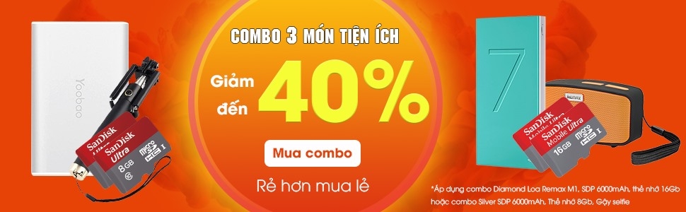 2 combo đang có mức giảm sâu 40% là combo Diamond (gồm: sạc dự phòng 6.000mAh, thẻ nhớ 16GB, loa bluetooth Remax M1) và combo Silver (gồm sạc dự phòng 6.000mAh, thẻ nhớ 8GB, gậy selfie). Nếu như được mua lẻ thì 2 combo này có giá lần lượt là 1.267.000 đồng và 777.000 đồng. Tuy nhiên, nếu mua theo combo, bạn sẽ nhận ưu đãi giảm 40% với giá chỉ còn 759.000 đồng và 459.000 đồng.