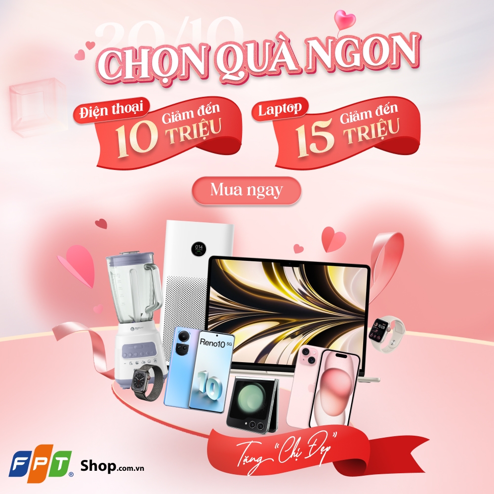 Theo đó, từ 13/10 – 22/10/2023, FPT Shop triển khai chương trình “Chọn quà ngon – tặng “chị đẹp”” với hàng loạt các sản phẩm đến từ các thương hiệu nổi tiếng được giảm giá ấn tượng lên đến 15.000.000 đồng. Đến ngay cửa hàng gần nhất để tham quan và mua sắm các sản phẩm “giá cực hời” để tặng người phụ nữ Việt nhân ngày đặc biệt này nhé.