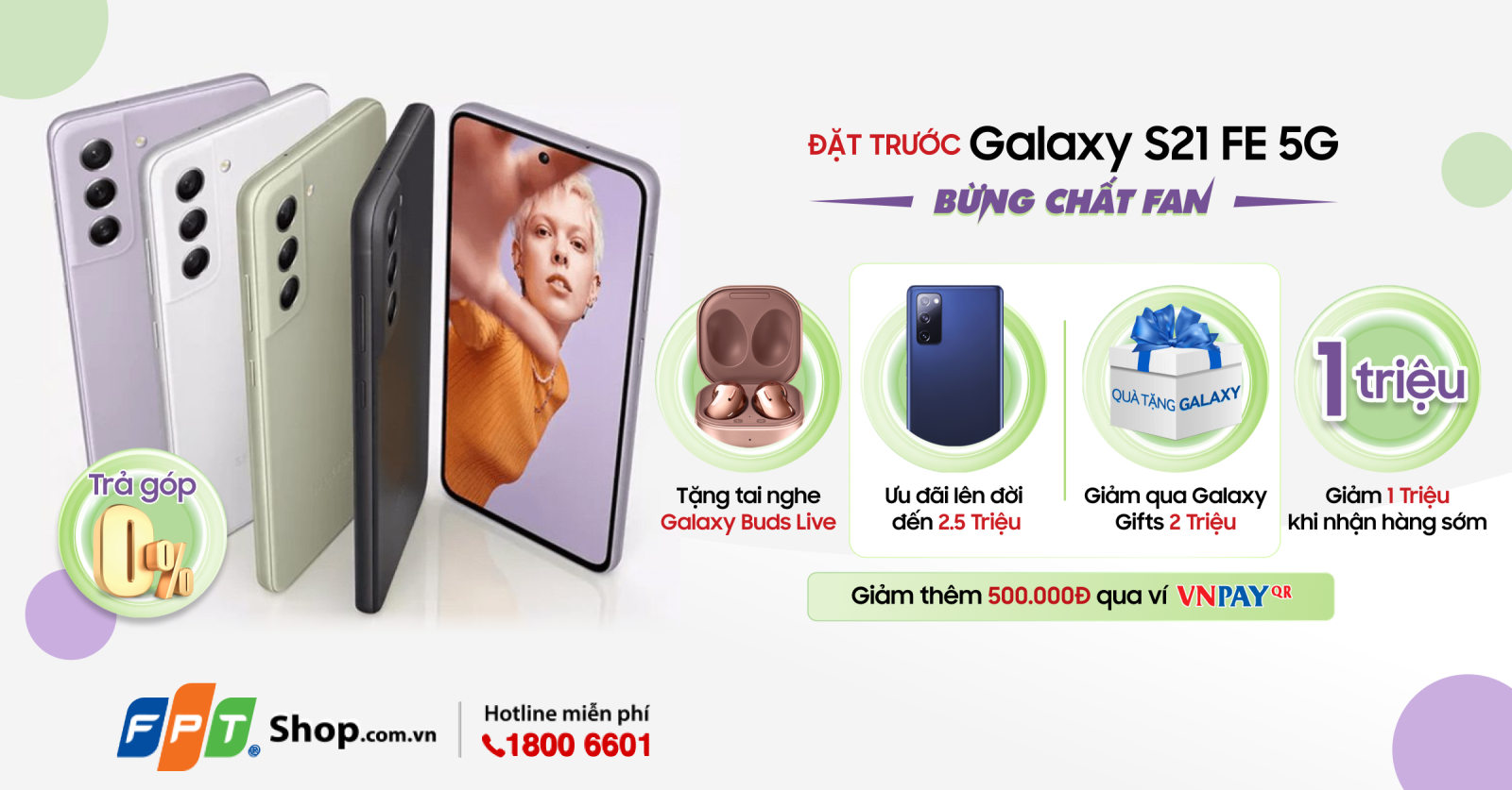 Từ hôm nay - 10/01/2022, chọn đặt trước Samsung Galaxy S21 FE 5G tại FPT Shop, khách hàng nhận ngay bộ quà trị giá đến 8.000.000 đồng. Đặc biệt, thêm quà tặng bất ngờ cho chủ nhân Galaxy S21 FE 5G, FPT Shop còn lì xì thêm 1.000.000 đồng cho tất cả khách hàng nhận máy sớm từ ngày 11/01 - 13/01 tại FPT Shop.