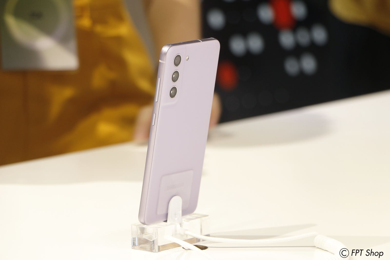 Galaxy S21 FE 5G sử dụng thiết kế Contour Cut, cụm camera sau cùng màu với mặt lưng nhựa mờ.