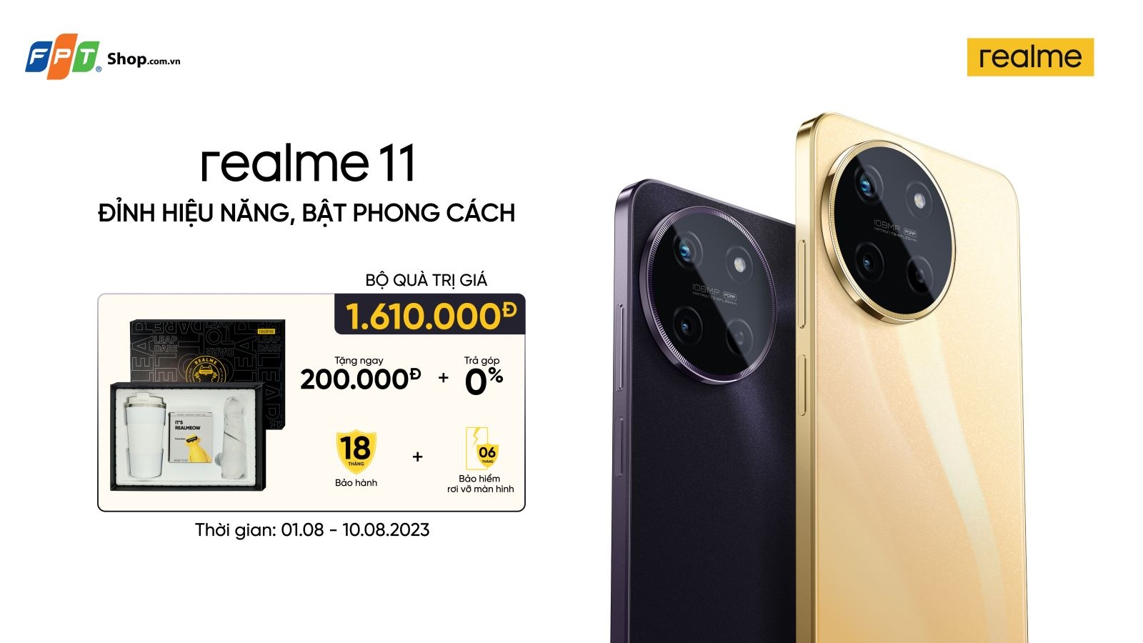 Từ ngày 01/08 – 10/08/2023, khách hàng đặt trước các sản phẩm Realme 11 series tại FPT Shop sẽ có cơ hội rinh ngay quà tặng hấp dẫn lên đến hơn 3.000.000 đồng.