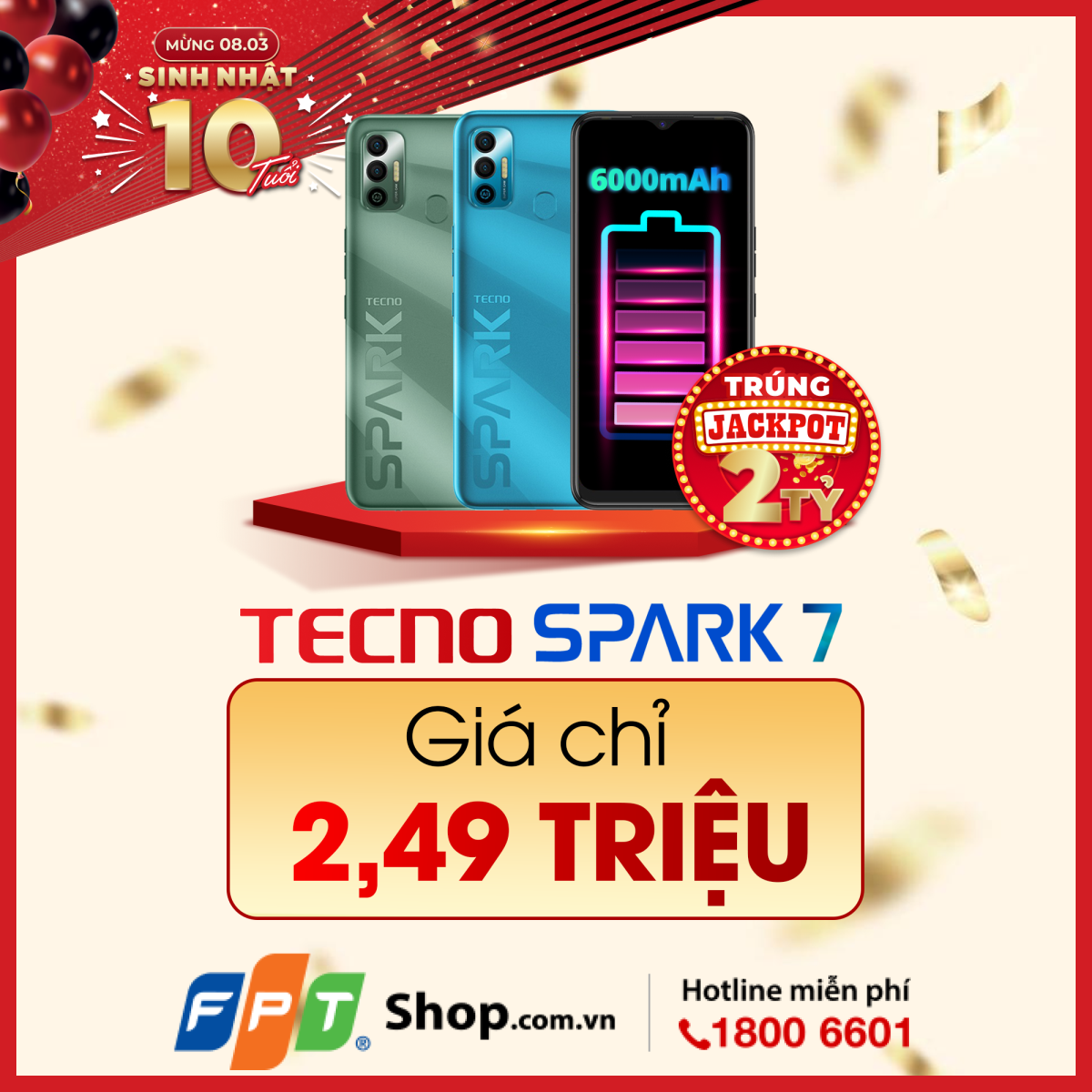Từ nay đến ngày 31/03/2022, khách hàng chọn mua smartphone Tecno Spark 7 tại FPT Shop sẽ được giảm còn 2,49 triệu và nhận nhiều quà tặng thiết thực khác.