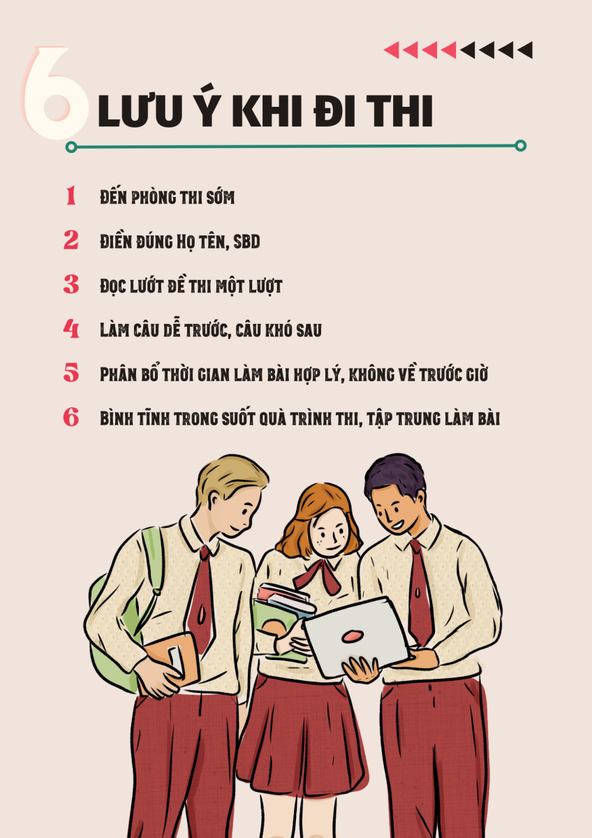 Trong ngày đi thi, bạn nên đến phòng thi sớm khoảng 30 phút, để có thời gian tìm phòng thi, vị trí ngồi, quen với môi trường xung quanh. Khi nhận được phiếu trả lời/giấy thi, việc đầu tiên bạn làm là điền đúng số báo danh, họ tên và các thông tin cần thiết. Trong quá trình làm bài bạn nên làm câu dễ trước, câu khó quá mất thời gian có thể bỏ qua, sau khi xong hết một lượt sẽ làm lại câu khó. Để ý căn thời gian hợp lý để đảm bảo hoàn thành hết toàn bộ bài thi. Trên đây là một số kinh nghiệm quý báu mà 2K5 nên ghi nhớ nhé.