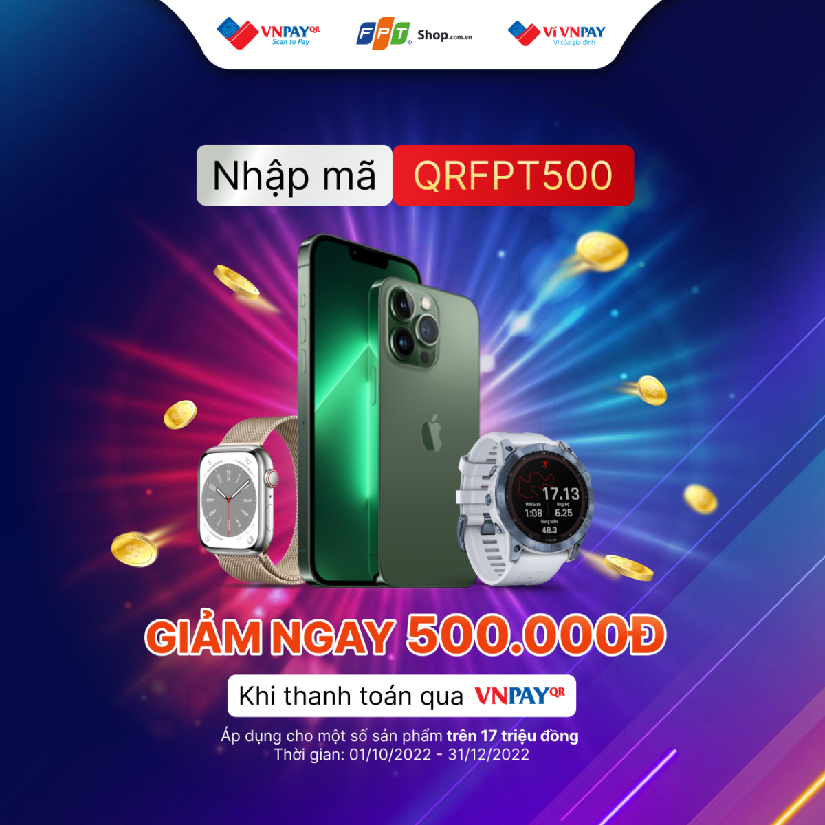 Từ nay đến ngày 31/12/2022, khách hàng mua sản phẩm có giá trên 17.000.000 đồng tại FPT Shop và chọn thanh toán qua VNPAY-QR sẽ được giảm 500.000 đồng.
