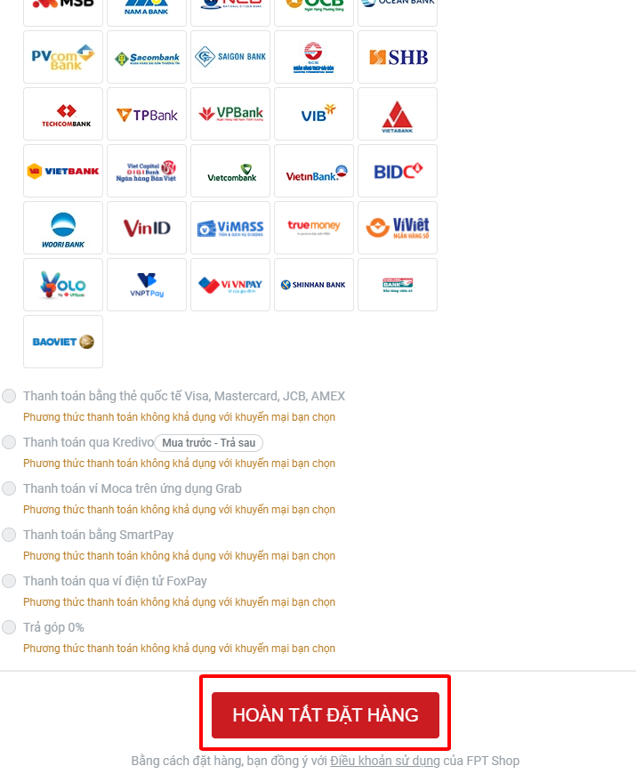 - Ưu đãi áp dụng cho các ngân hàng và ví điện tử: Agribank, BIDV, VietinBank, Vietcombank, SCB, IVB, Ocean Bank, ABBank, Eximbank, HDBank, Nam A Bank, VietBank, BIDC, SaiGonBank, Kiên Long Bank, Bảo Việt Bank, VietABank, Ví VNPAY